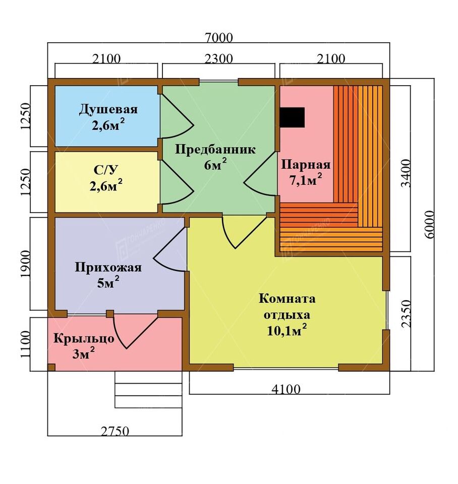| Окна | В парилке 300*300 мм, в предбаннике 500*800 мм, деревянные окна. |
