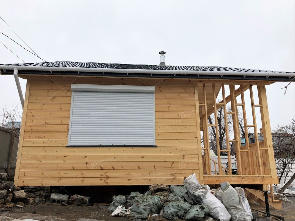 Каркас - доска, утеплитель 100 мм., пароизоляционная мембрана, ветрогидрозащитная мембрана. Внутренняя отделка ГКЛ. Отделка фасада имитация бруса. |