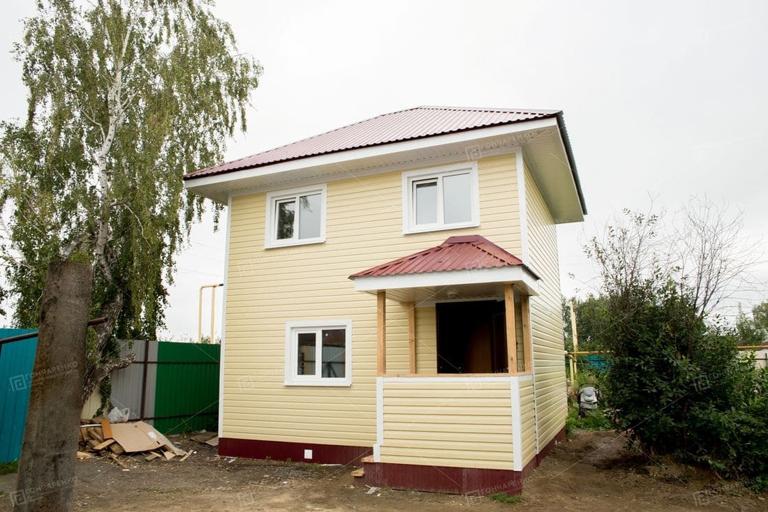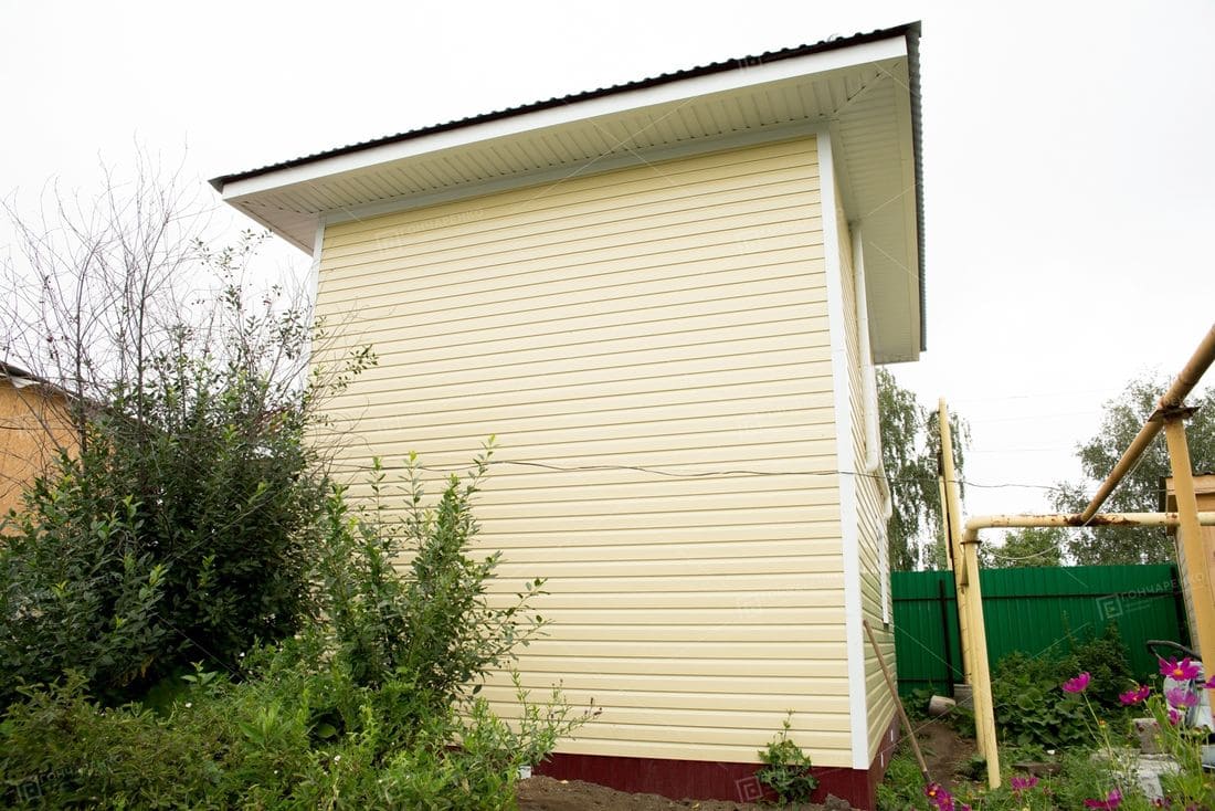 Каркас - доска, утеплитель 100 мм., пароизоляционная мембрана, ветрогидрозащитная мембрана. Внутренняя отделка ГКЛ. Отделка фасада имитация бруса. |