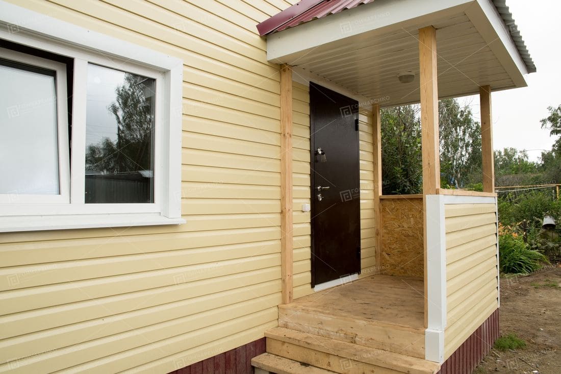 Дом под ключ с верандой всегда выглядит привлекательно и идеально подойдет для небольших участков. Однако он еще и функционален. Крыльцо защитит вас в непогоду, пока вы будете открывать дверь. Кроме того, на крылечке можно оставлять обувь или красиво расставить горшки с цветами. Сам дом имеет большую комнату для отдыха и кухню столовую. Это очень удобная планировка. При желании можно будет зонировать пространство.