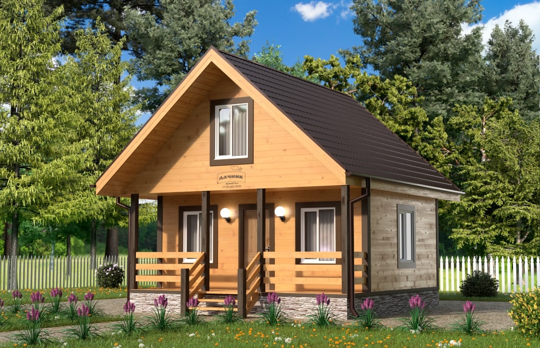 Дом под ключ с верандой всегда выглядит привлекательно и идеально подойдет для небольших участков. Однако он еще и функционален. Крыльцо защитит вас в непогоду, пока вы будете открывать дверь. Кроме того, на крылечке можно оставлять обувь или красиво расставить горшки с цветами. Сам дом имеет большую комнату для отдыха и кухню столовую. Это очень удобная планировка. При желании можно будет зонировать пространство.